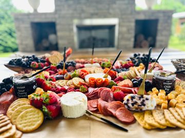 15 feet of charcuterie graze table. Wow your guest with an unforgettable display of fresh fruits, premium Italian deli meats, cheeses, jams, spreads and crackers. Plates, napkins, cocktail forks included. Tables and tablecloth rental included.