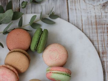 Handmade Macarons available in Madagascar Black Vanilla, Belgian Chocolate, Sicilian Pistachio, Red Velvet, Mango, Chocolate Praline, Lemon Cream, Rose, Salted Caramel, Coconut, Tiramisu, and Banana Chocolate