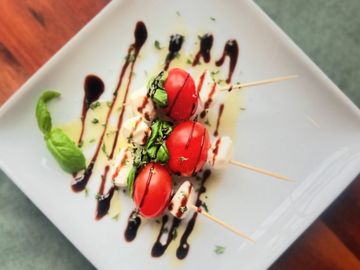 Fresh cherry tomatoes, mozzarella, fresh basil, balsamic reduction sauce
